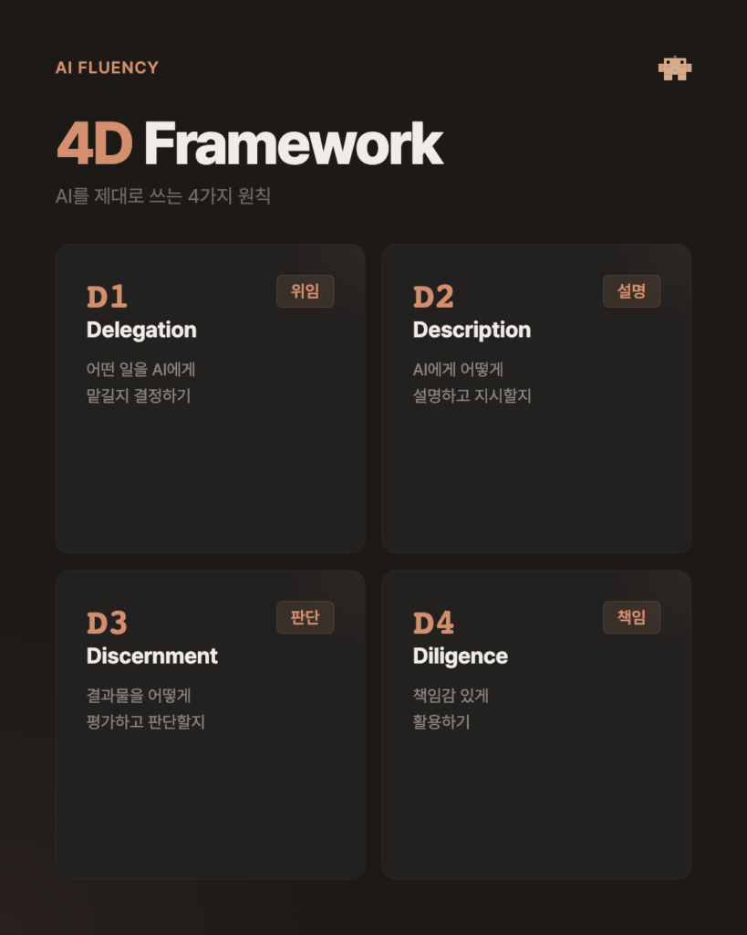 핵심은 4D 프레임워크라는 개념입니다. Delegation(어떤 일을 맡길지), Description(어떻게 설명할지), Discernment(결과를 어떻게 판단할지), Diligence(책임감 있게 활용하기)로 구성됩니다. 거창하게 들릴 수 있지만, 요약하자면 “AI에게 제대로 부탁하고, 결과를 제대로 판단하는 방법”을 체계적으로 배우는 과정이라고 보면 돼요.